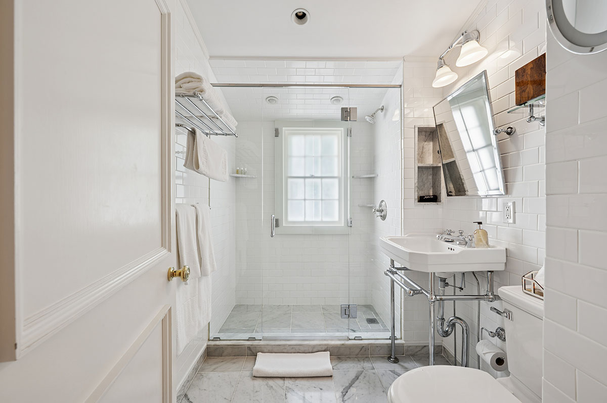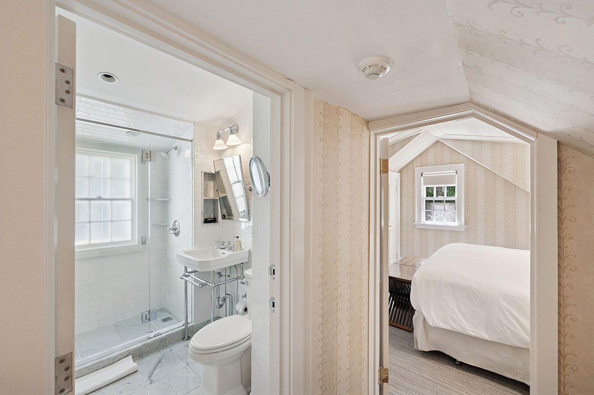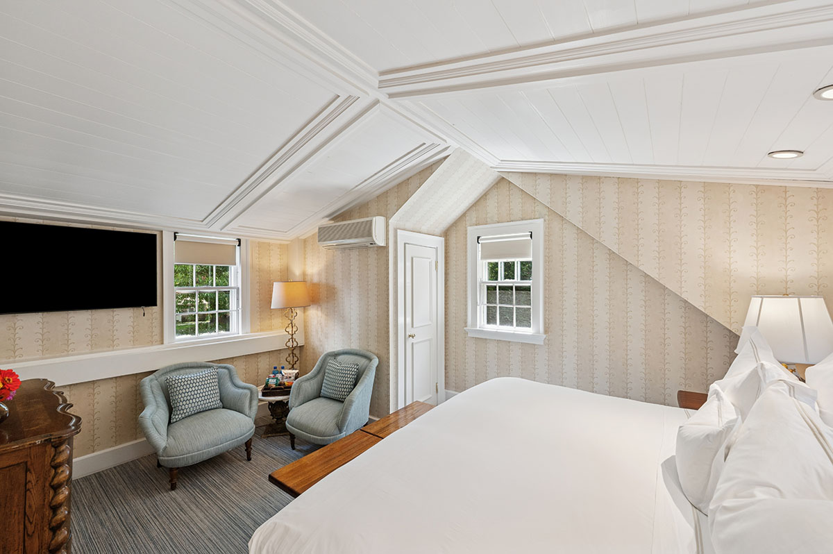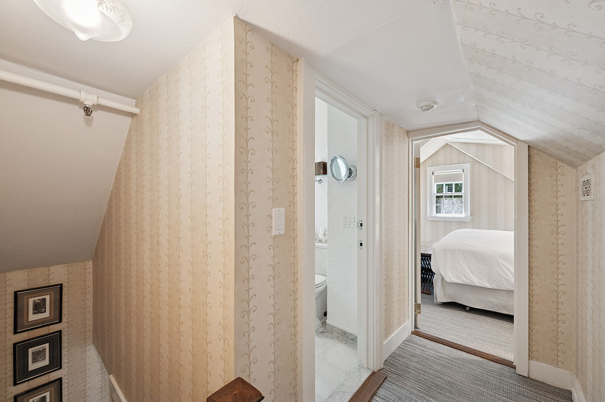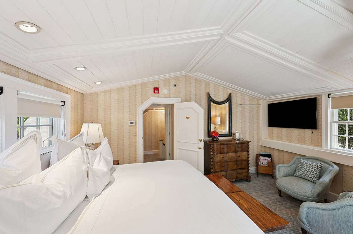 Tucked away upstairs, this private sanctuary offers a King bed (or optional two twins) while sloped ceilings transport guests to the inn’s earliest era. The spacious private hallway bathroom is exclusively yours during your stay, offering authentic colonial character with modern comfort.